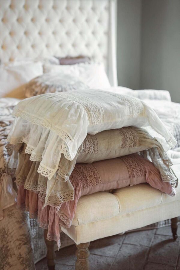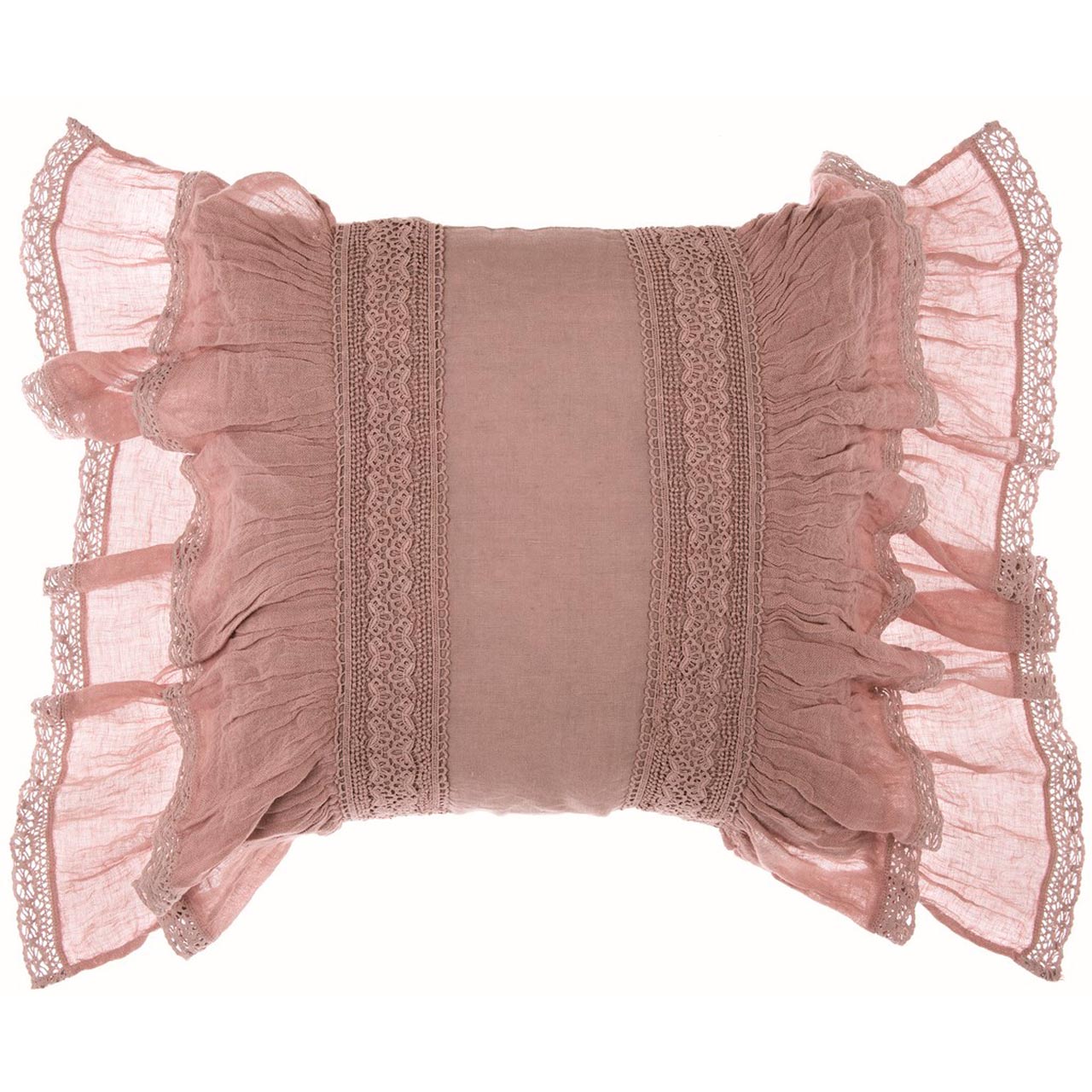 Romantico cuscino rosa polvere in lino con gale e pizzo, imbottitura inclusa. Perfetto per un atmosfera shabby chic o vintage.