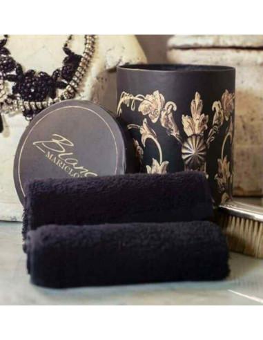 Elegante scatola regalo firmata Blanc Mariclò contenente tre soffici lavette nere di puro cotone della misura di 30x30cm. Oltre all'utilità delle morbide lavette è possibile utilizzare la scatola come oggetto decorativo per le nostre camere da bagno.