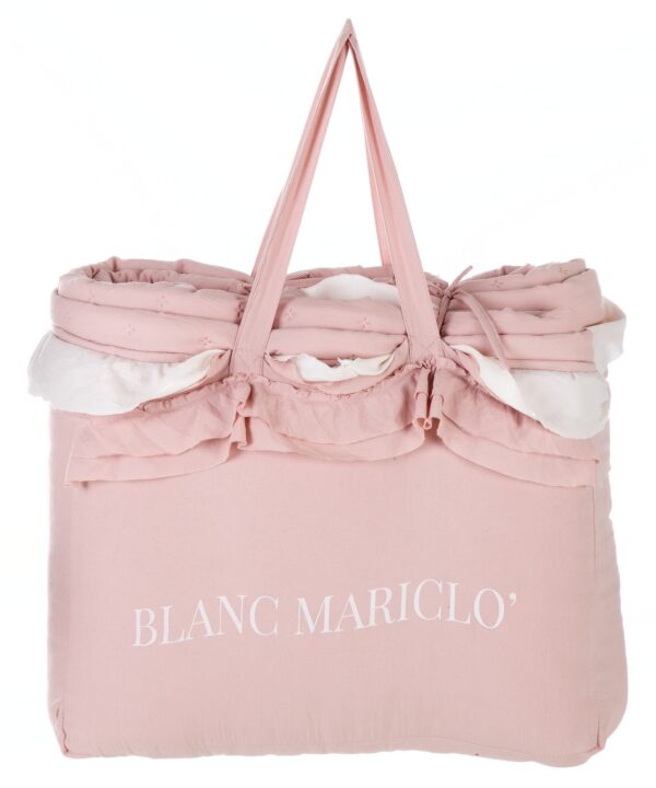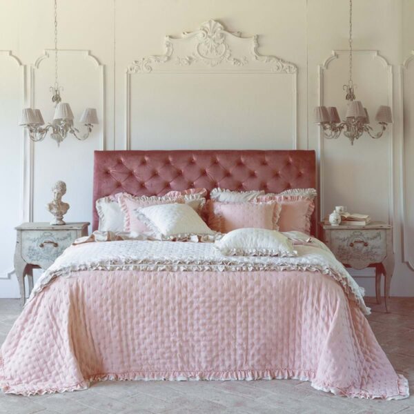 Questo boutis matrimoniale è rifinito su tre lati da un doppio volant con taglio a vivo ,uno rosa e uno panna.