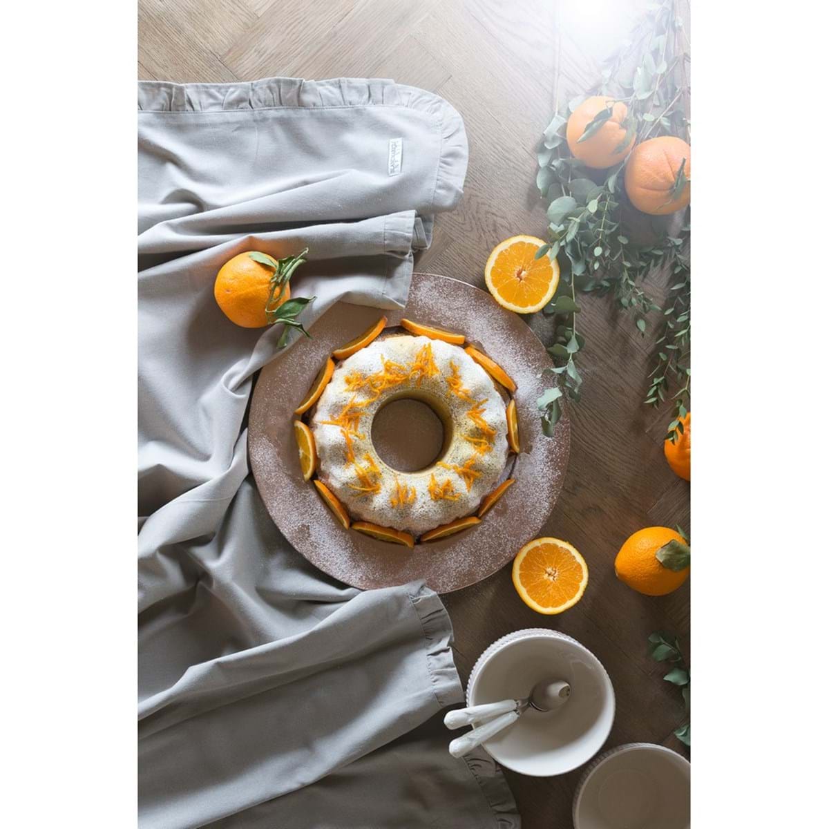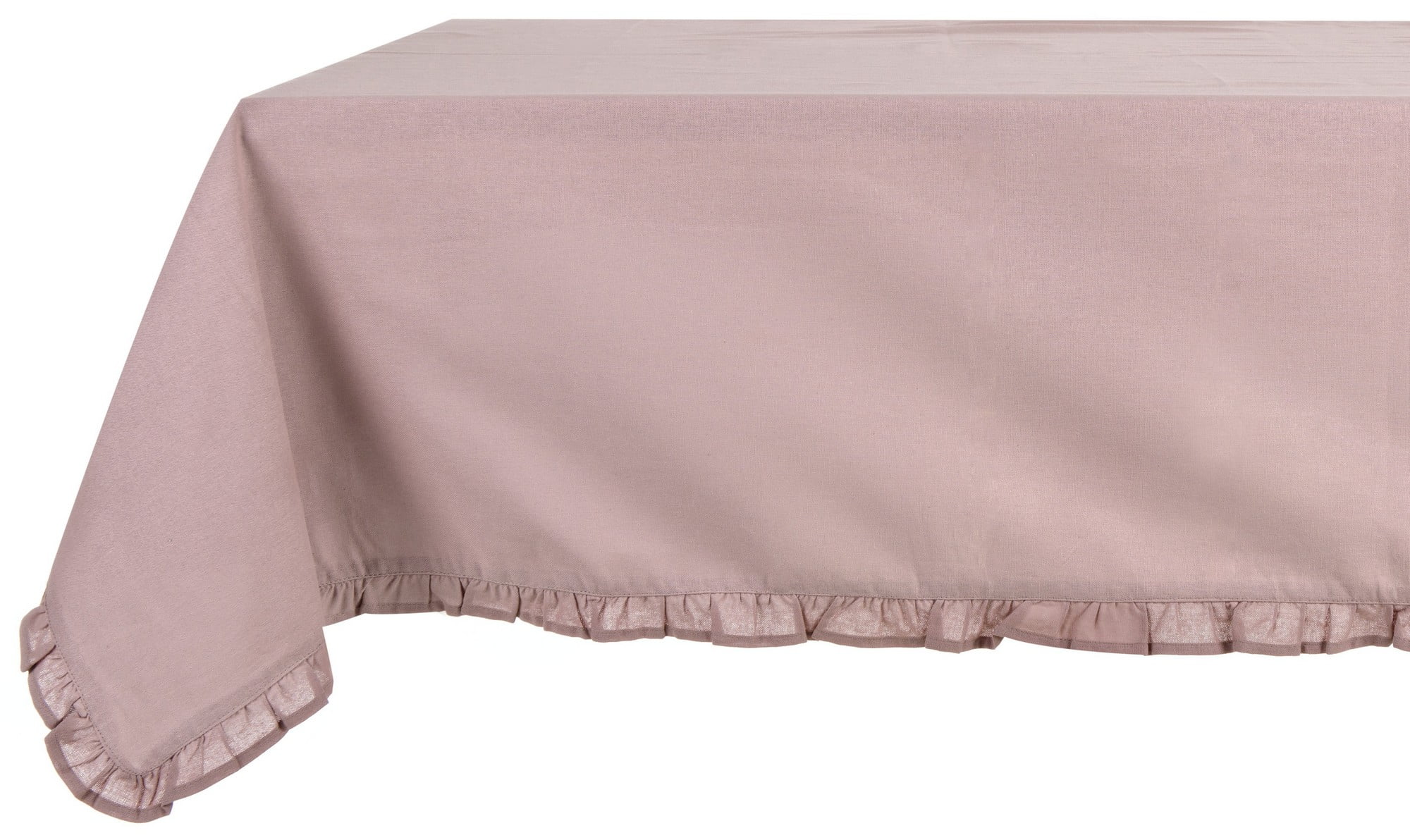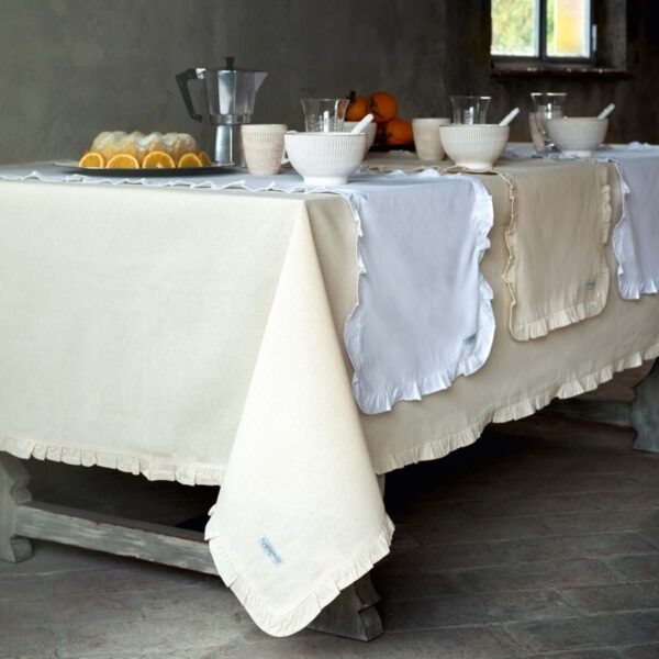 Tovaglia realizzata in puro cotone e decorata su tutti i lati da un delicato volant.