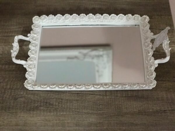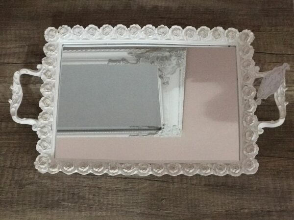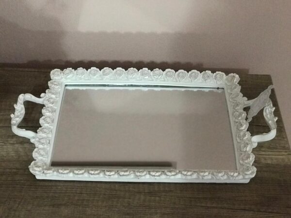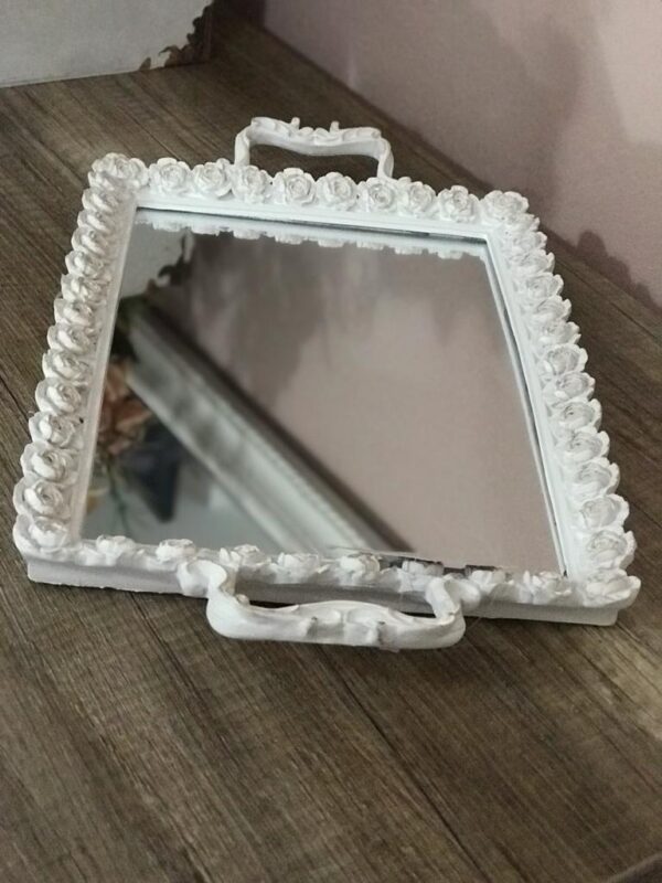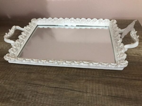 Elegante vassoio rettangolare decorato con roselline, in resina, bianco decapato con specchio alla base ed eleganti manici decorati.