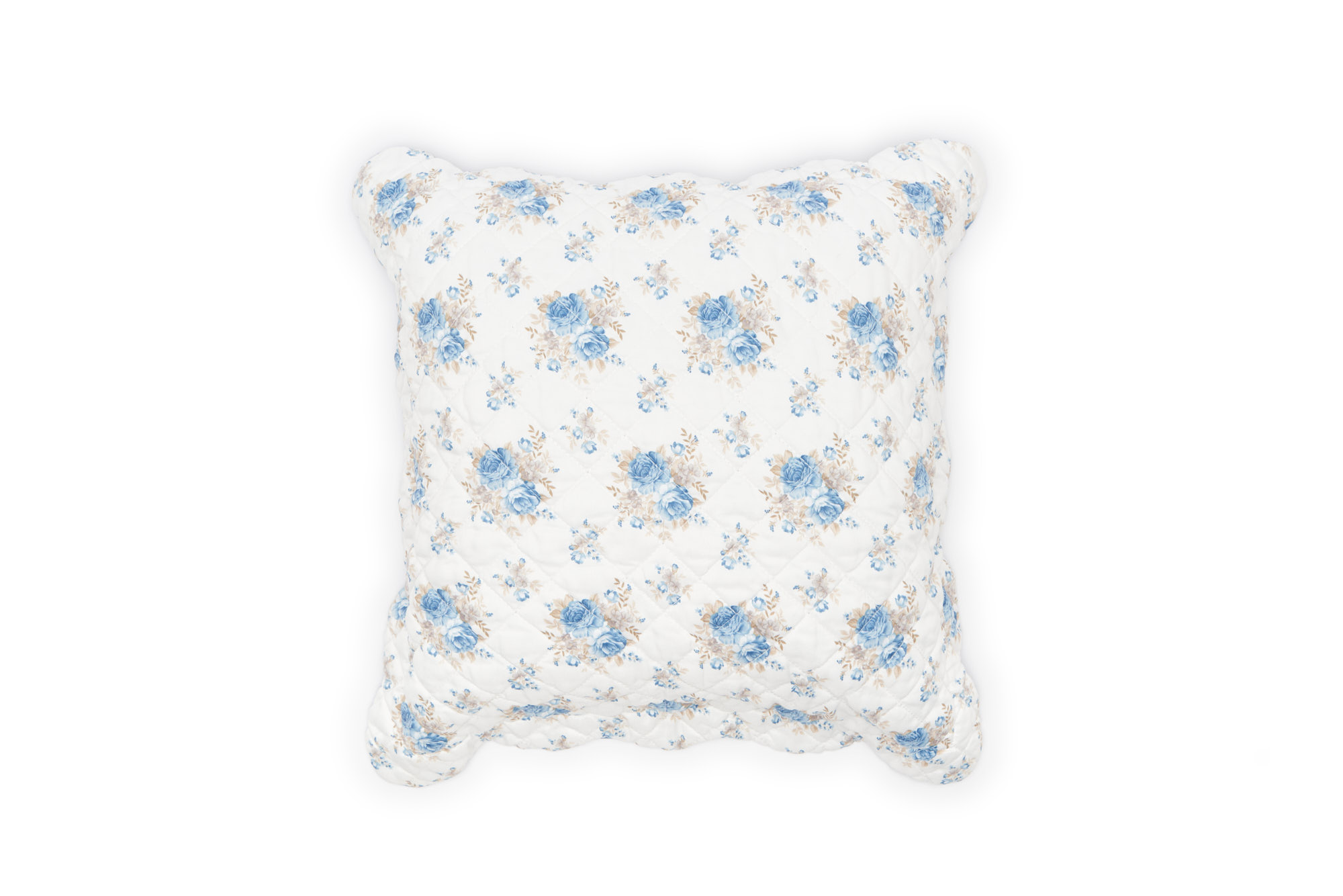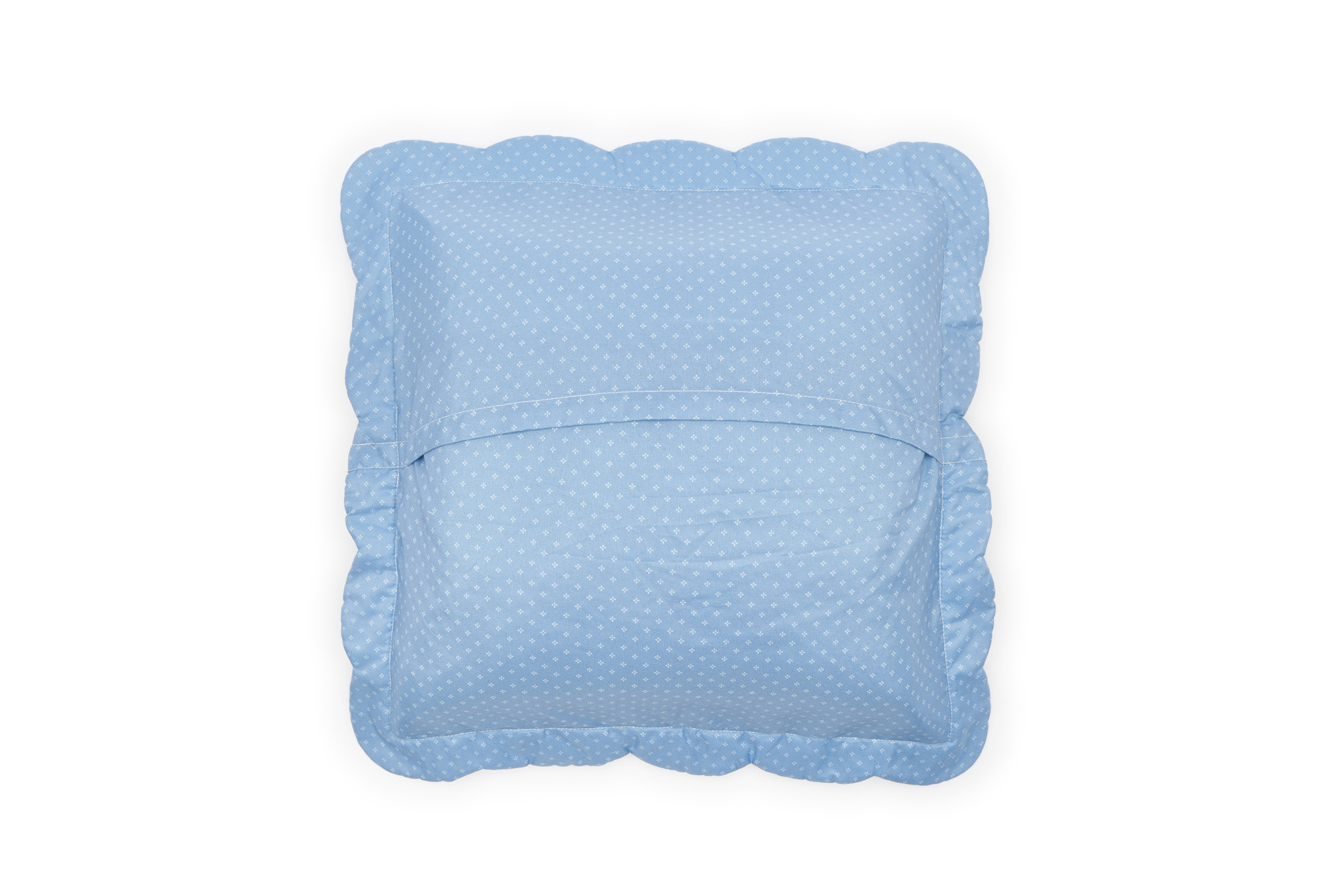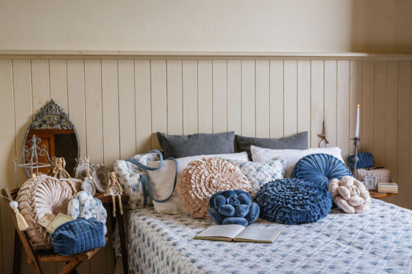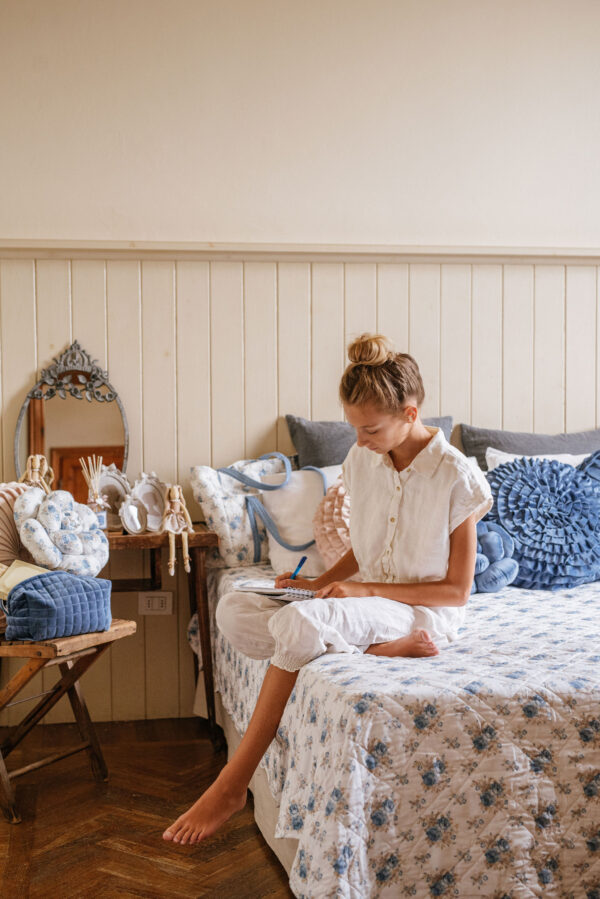 Romantico cuscino con balza della collezione primavera/estate della Nuvole di Stoffa, realizzato in morbido tessuto trapuntato con un motivo floreale nei toni dell’azzurro su fondo bianco.