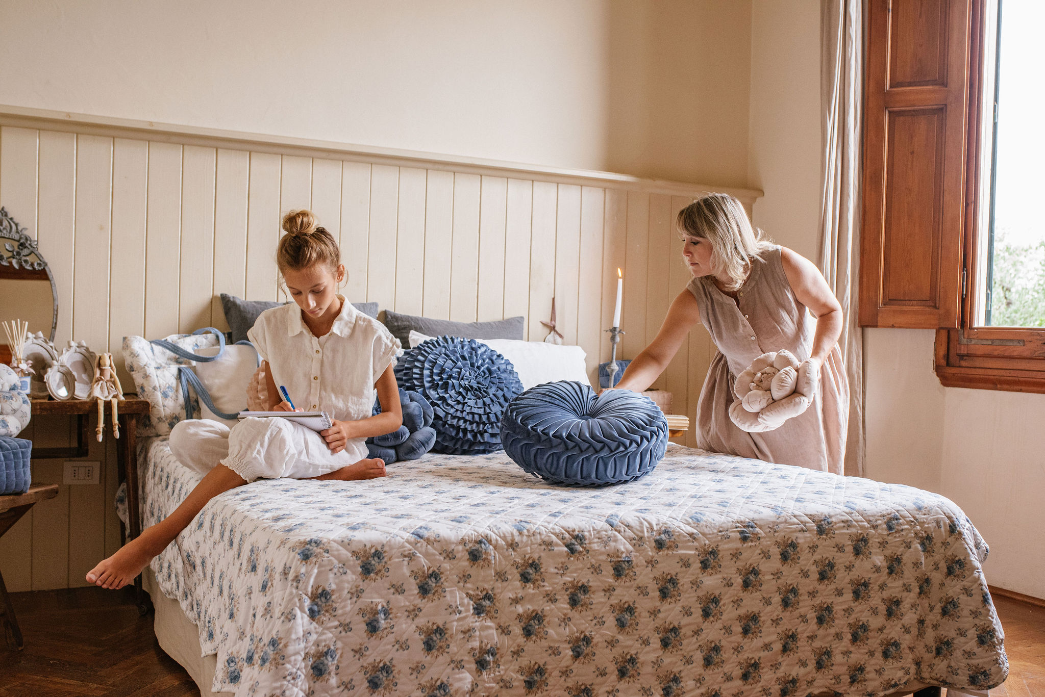 Romantico cuscino con balza della collezione primavera/estate della Nuvole di Stoffa, realizzato in morbido tessuto trapuntato con un motivo floreale nei toni dell'azzurro su fondo bianco. Ideale per una camera da letto romantica ed elegante in perfetto stile provenzale in abbinamento alla linea dei boutis disponibili in varie dimensioni. Il cuscino è completamente sfoderabile e completo di interno.