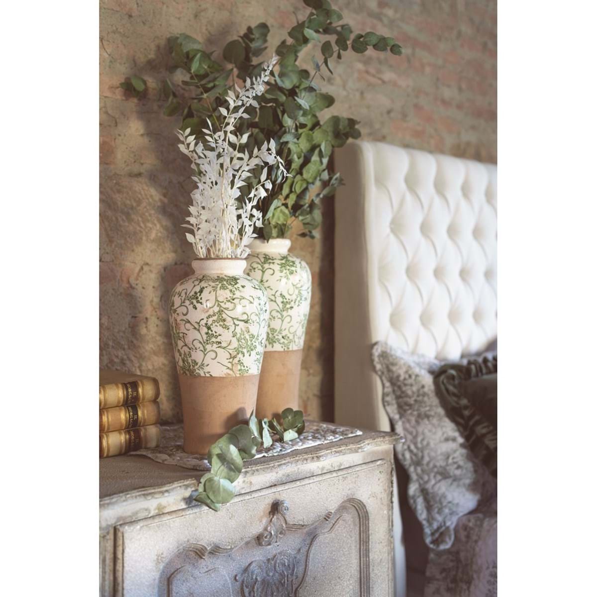 Elegante vaso firmato Blanc Mariclò realizzato in ceramica. Il vaso in stile shabby chic, con effetto invecchiato, presenta una parte naturale di color mattone e la parte superiore di ceramica decorata con un motivo floreale sul verde. Questo vaso è un pezzo immancabile per gli ambienti di casa dallo stile romantico, vissuto e retrò.