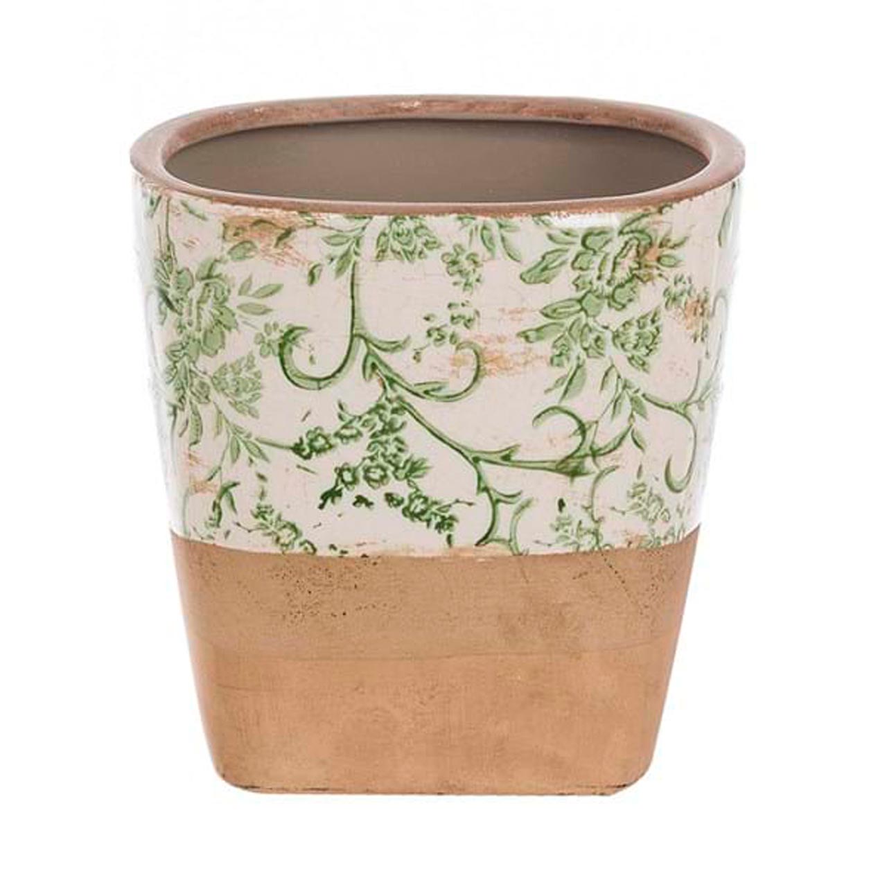 Elegante vaso firmato Blanc Mariclò realizzato in ceramica. Il vaso in stile shabby chic, con effetto invecchiato, presenta una parte naturale di color mattone e la parte superiore di ceramica decorata con un motivo floreale sul verde.